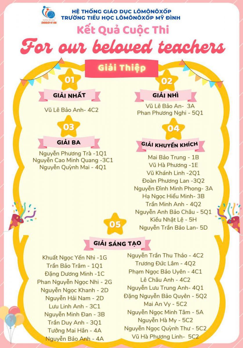 Mùa tri ân năm nay tại mái trường mến yêu thêm ấm áp và ý nghĩa với những tình cảm gửi gắm tới các thầy cô của các con học sinh trường Tiểu học Lômônôxốp Mỹ Đình qua cuộc thi “For our beloved teachers - gửi tới thầy cô thân yêu”.