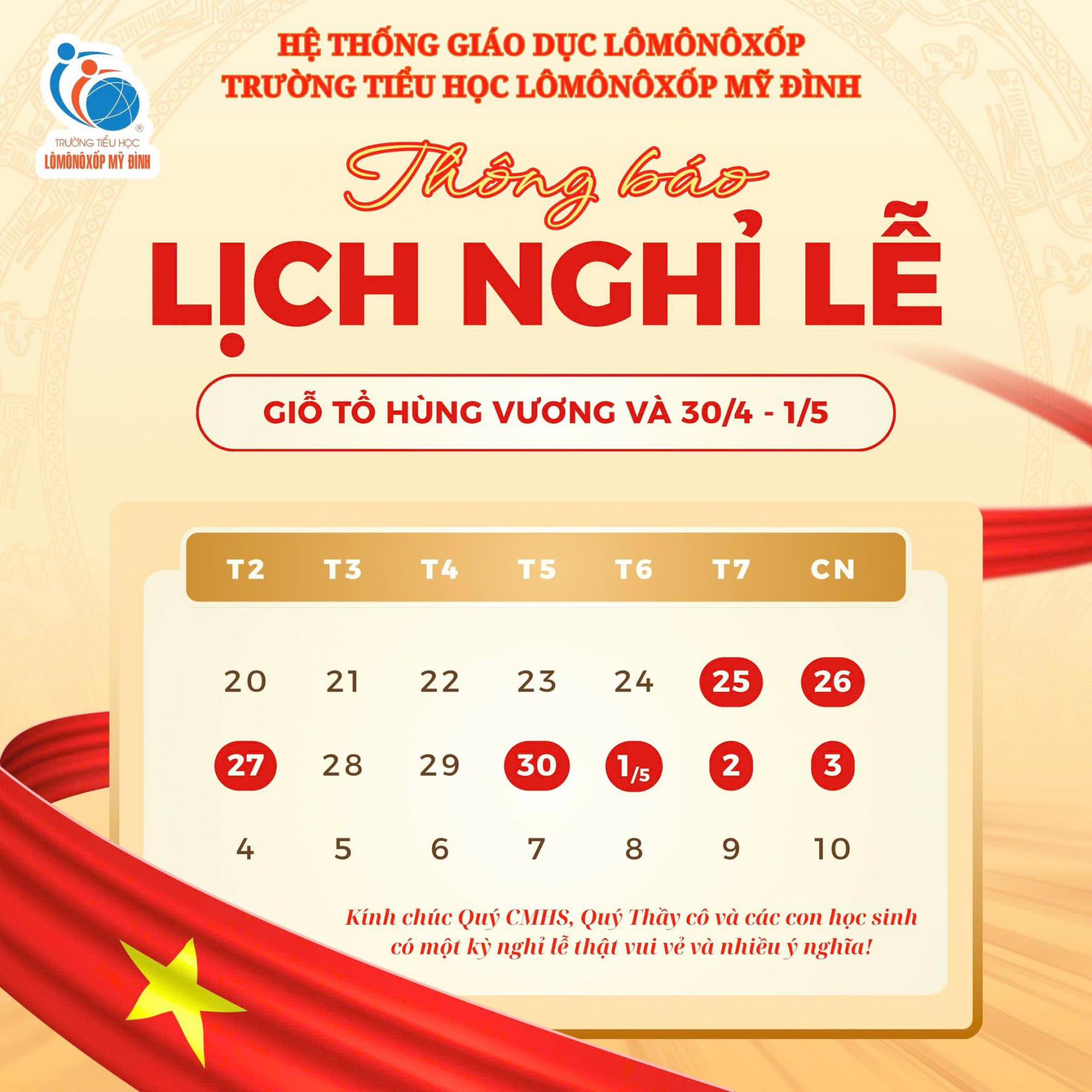 Trường Tiểu học Lômônôxốp Mỹ Đình xin thông báo tới Quý phụ huynh và các em học sinh lịch nghỉ các ngày lễ, cụ thể như sau: