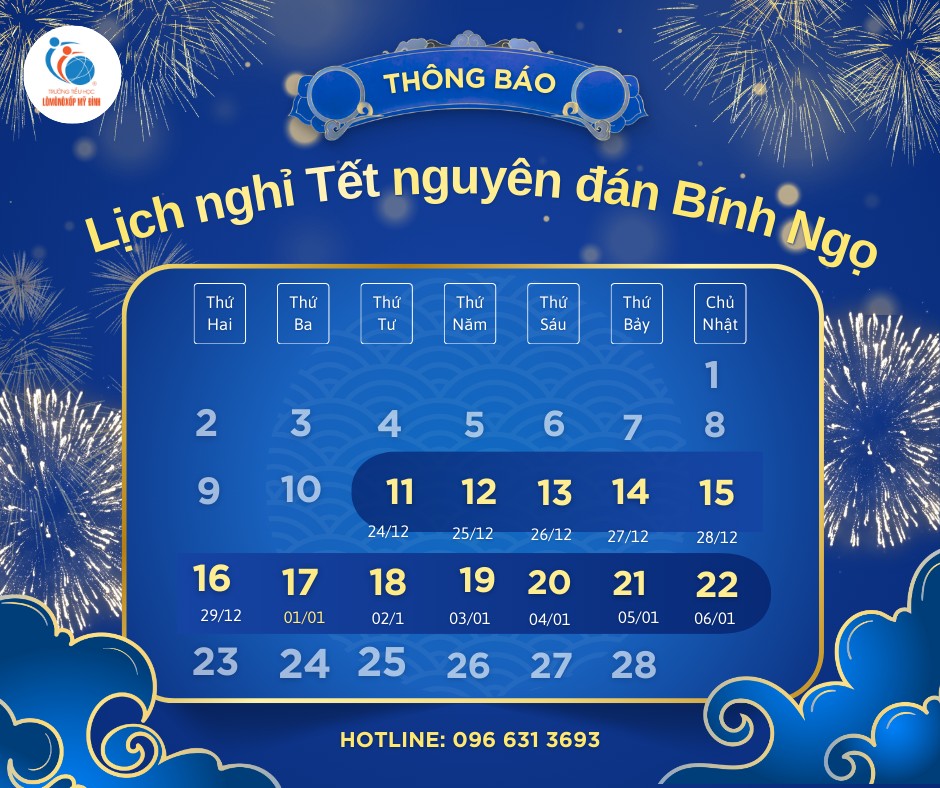 - Nhà trường sẽ nghỉ tết từ thứ Tư, ngày 11/02/2026 ( tức 24/12 AL) đến hết ngày 22/02/2026 ( tức 06/01 AL).