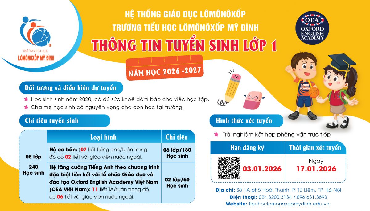 Trường Tiểu học Lômônôxốp Mỹ Đình trân trọng kính gửi tới Quý Cha mẹ học sinh thông tin đăng ký tuyển sinh lớp Một năm học 2026 – 2027: